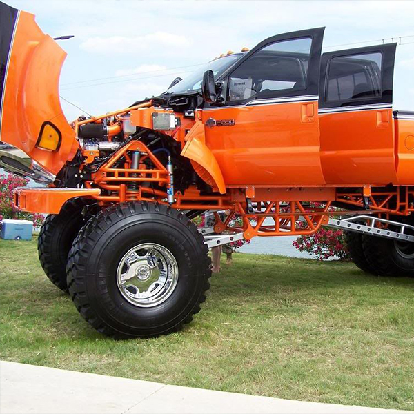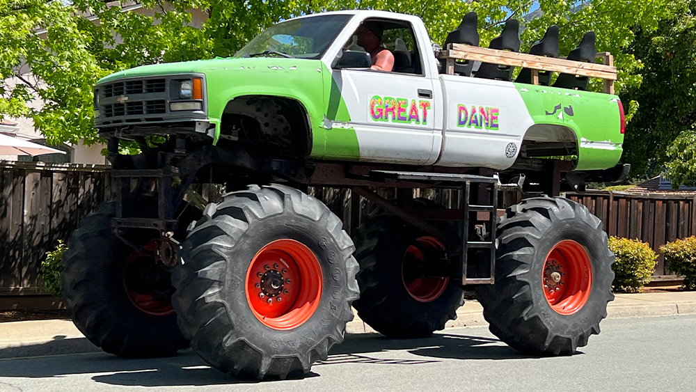 The Great Dane was designed to provide an authentic monster truck experience. It is built on a 1997 Chevy 2500 body and powered by a 383 Chevy Vortec engine, supported by a 4L80 racing transmission and 5-ton Rockwell axles.